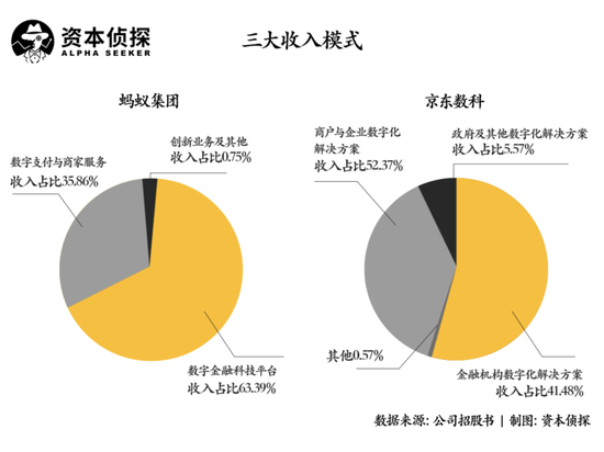 同样孵化于电商巨头,同样是从“金融科技”浪潮中成长起来的关键角色,京东数科是常与蚂蚁集团放在一起比较的对象,但是细究双方招股书后可以发现,京东数科与蚂蚁集团在营收结构和发力重点上存在实际不同。