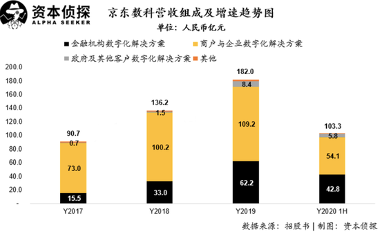 2017年、2018年、2019年和2020年上半年,京东数科分别实现营收90.7亿元、136.16亿元、182.03亿元和103.27亿元。