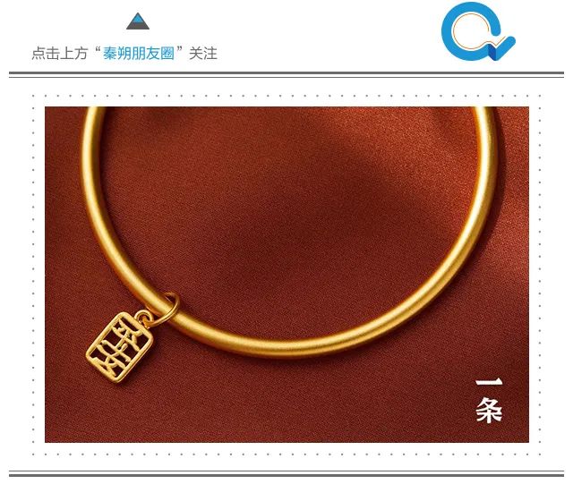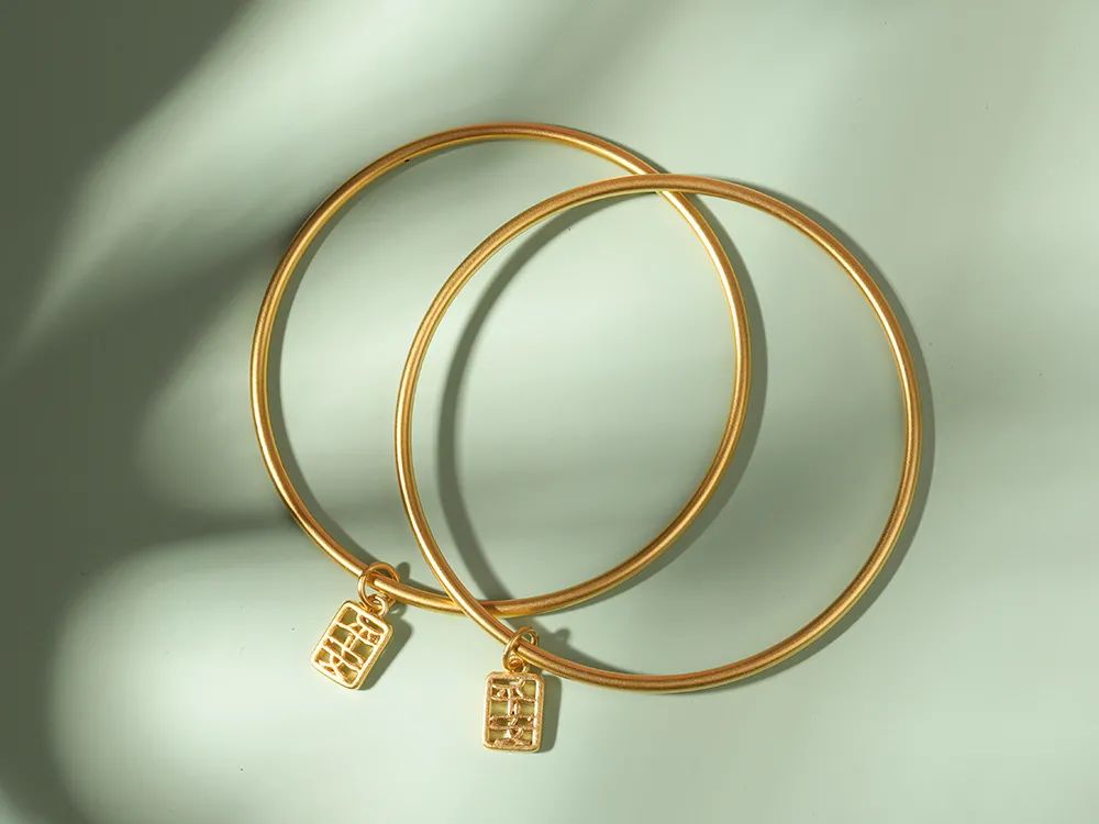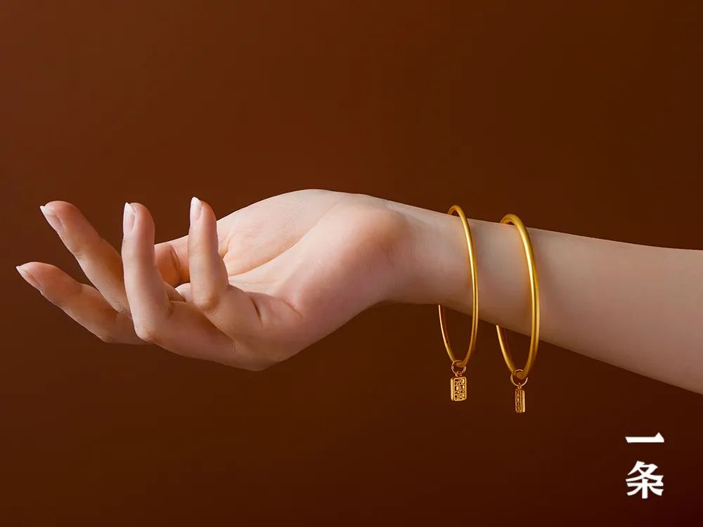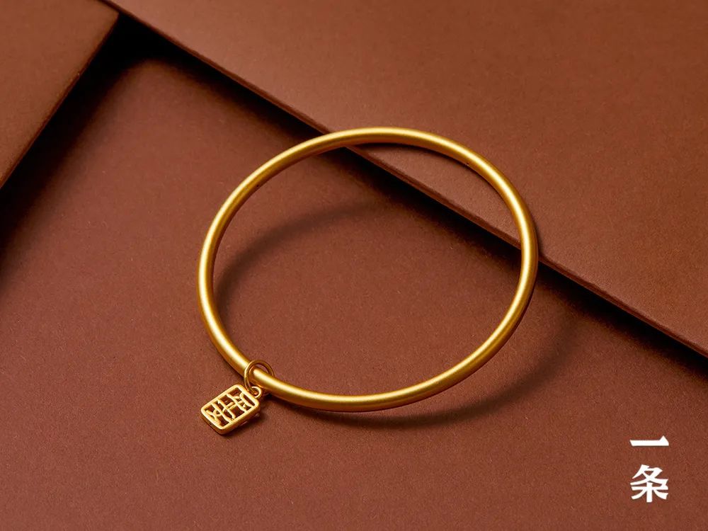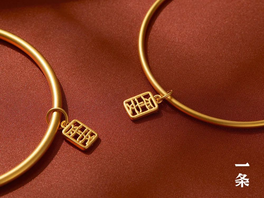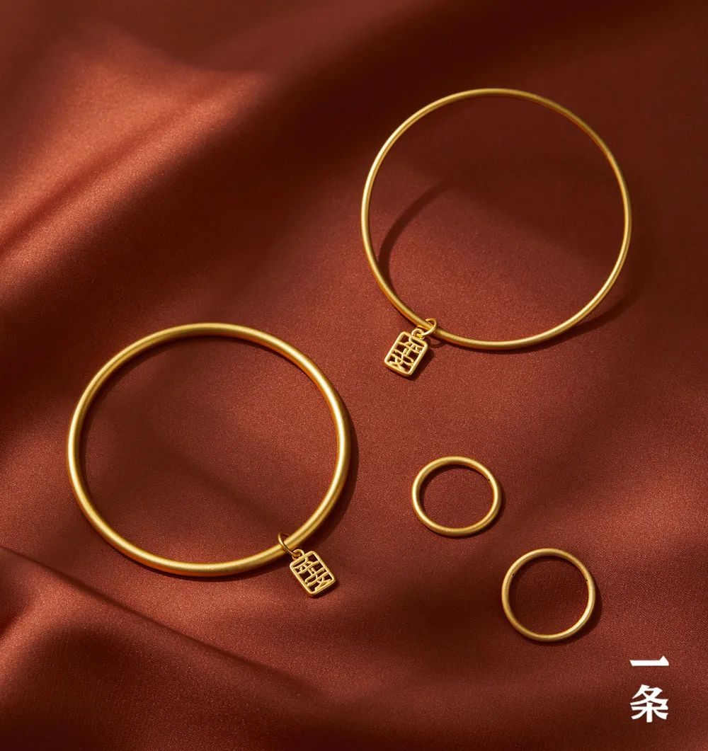 手镯是“平安喜乐”古法足金系列中的一款,名为“太极圈”,有粗圈/细圈两款。