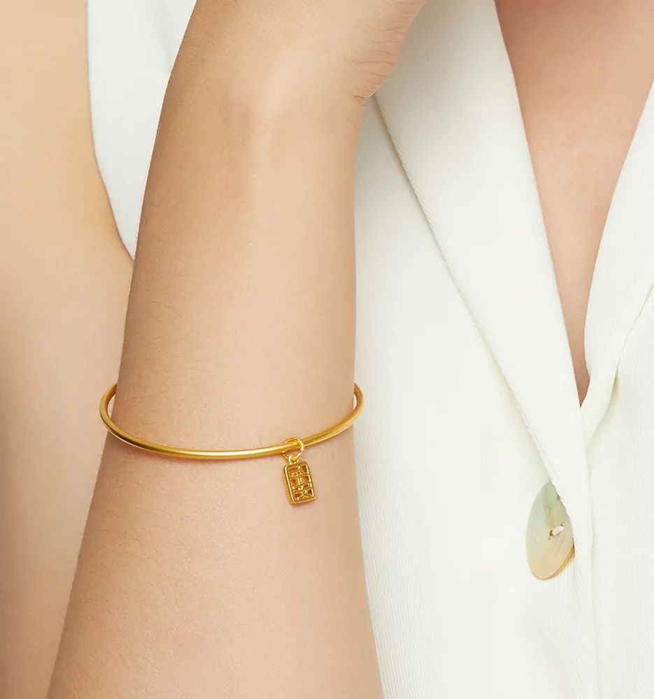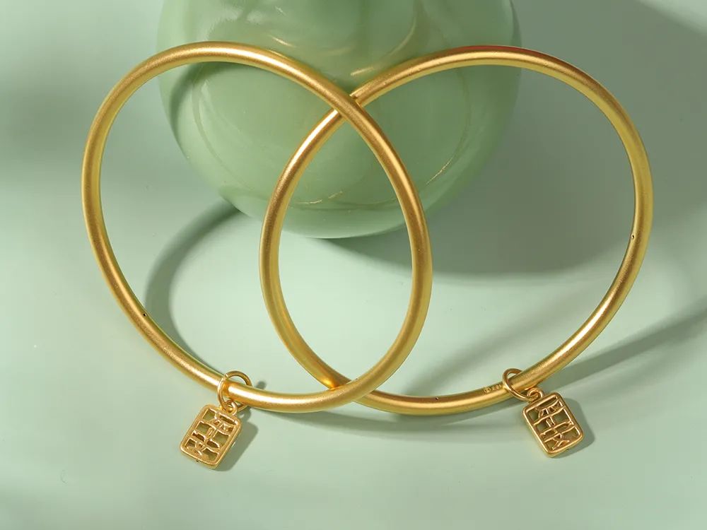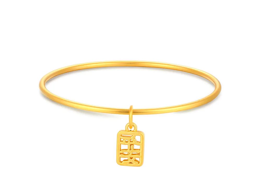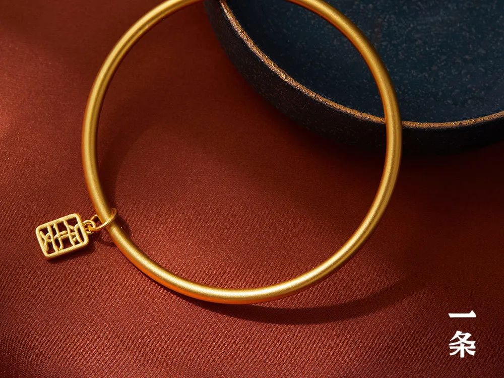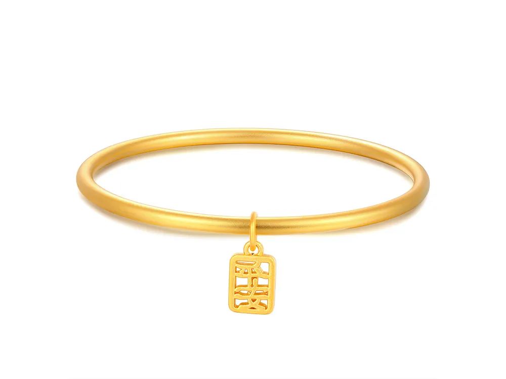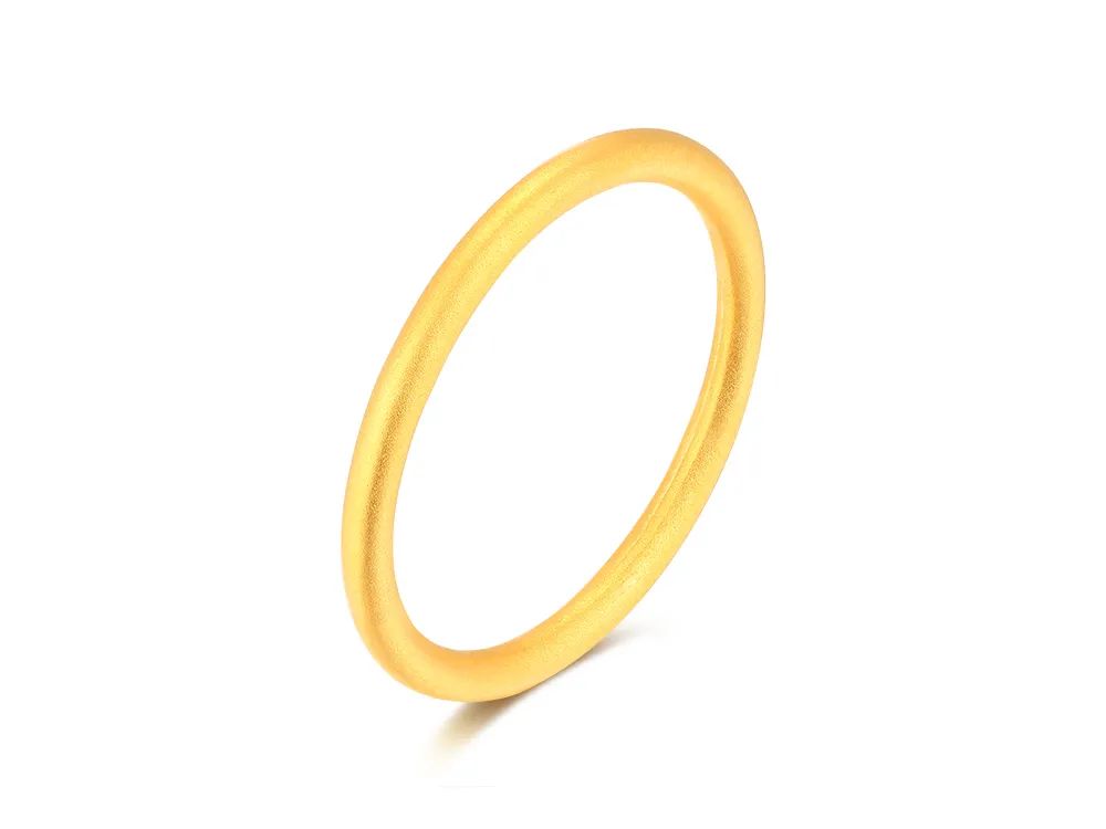 手镯是“平安喜乐”古法足金系列中的一款,名为“太极圈”,有粗圈/细圈两款。