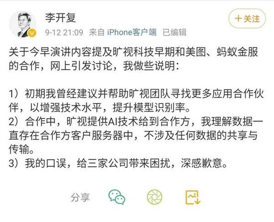 「我们关注到李开复先生在公开场合提及蚂蚁金服和旷视科技的合作,需要澄清的是:
