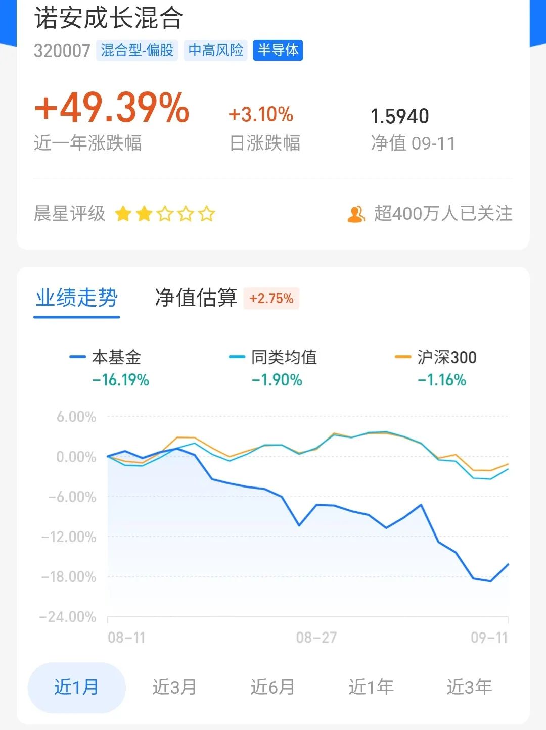 结果是,诺安成长混合的表现与半导体行业股票的整体表现挂钩。涨的时候一起涨,跌的时候也跑不了。