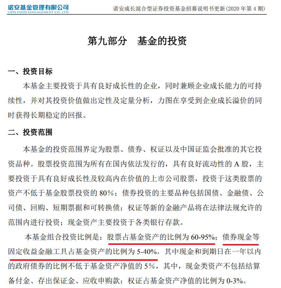 这种混合型基金的投资范围更加灵活,比如诺安成长混合的基金规定是:股票占基金资产的60%-95%,债券、现金等固定收益类资产占基金资产的5%-40%。