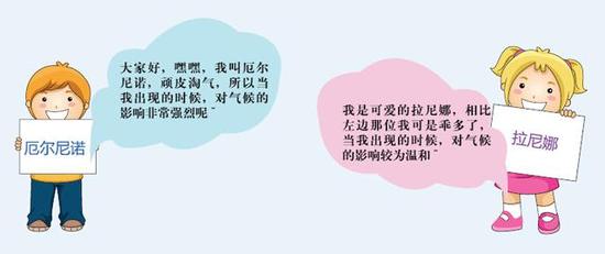 厄尔尼诺(Elnino,意为“小男孩”)和拉尼娜(Lanina,意为“小女孩”)分别代表了赤道太平洋海温的两种极端状态,每隔几年就大致交替出现——有研究表明周期大约是2-11年,但这个周期并不稳定。