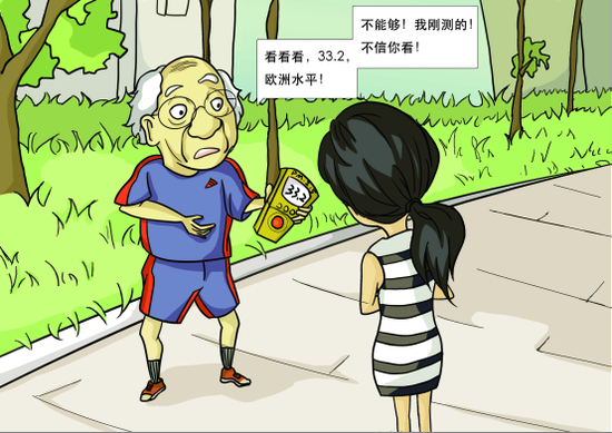 他说:“不能够!我刚测的!不信你看!”说着就掏出监测仪,戴上老花镜指给我:“看看看,33.2,欧洲水平!”