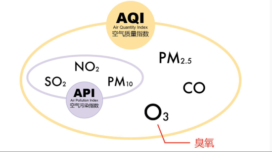 我国以前衡量空气质量,用的是API(Air Pollution Index:空气污染指数),只衡量3 种大气污染物:SO2、NO2 和PM10。现在改成了AQI(Air QuantityIndex:空气质量指数),一共要衡量6 种大气污染物,除了上面3 种以外,又增加了3 种大气污物:PM2.5、O3(臭氧)、CO。