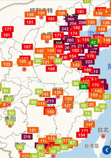 只见标有监测值的地图上,半壁江山一片红,华北和长三角基本都沦陷了,个别地方红得发紫,珠三角也状况不佳。