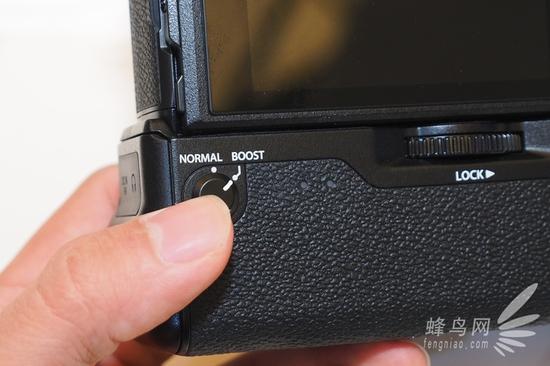 与富士X-T2机身一同发布的,还有一款VPB-XT2竖拍手柄。这款手柄最大的特点就是具备“增能”模式,用户在下图中的位置拨动模式拨杆至 “BOOST”之后,手柄内两块电池提供的额外电压令机身具备约0.17秒的拍摄间隔、0.045秒的快门时滞(!)、0.114秒的拍摄黑屏时间以及 11张/秒的最大连拍速度(连续自动对焦模式),无论是拍摄间隔还是快门时滞都达到了非常高的水平,发布会现场富士公司的PPT也给出了“取代单反相机” 的口号。