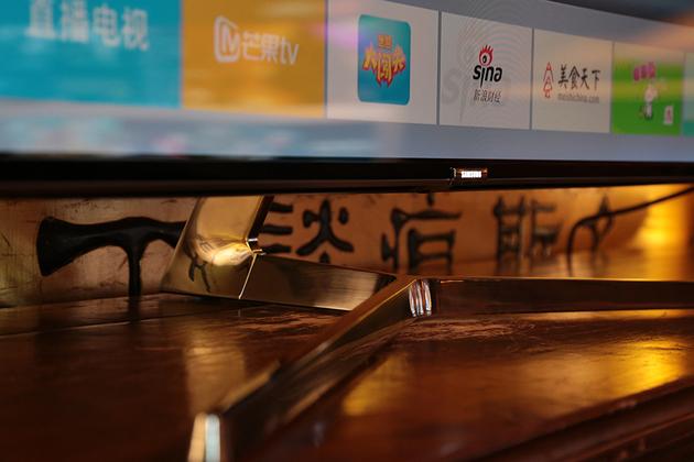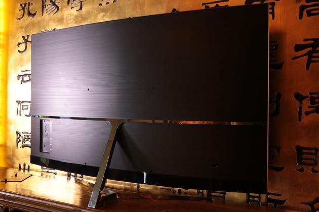 电视支架也并没有采用常见的左右脚架,而是使用了呼应曲面屏幕的弧形设计,延续了整个产品的设计语言。