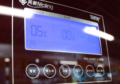 在机身上方,美菱BCD-242HE3B冰箱设有大屏幕LCD显示屏,采用感应触摸按键,能分别显示和调节冷藏室、变温室和冷冻室的温度,十分方便。