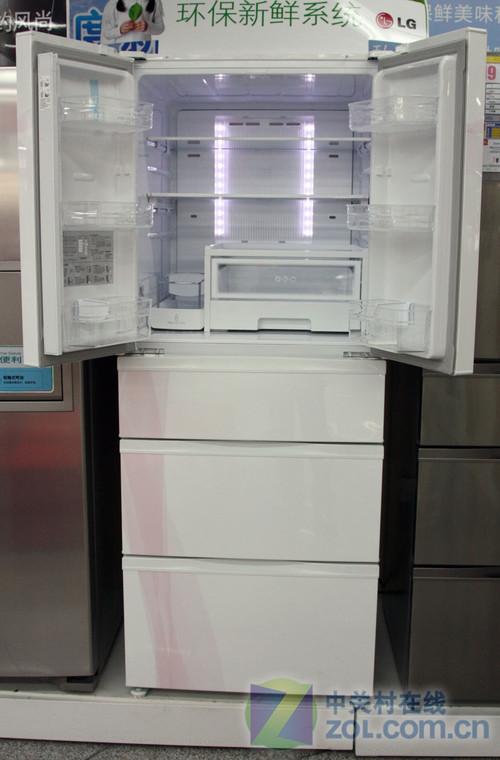 这款LG冰箱总容积为376L,同时也是LG首款多开门冰箱,在内部设计上也表现出色,提供了放置饮料的区域,方便用户使用。而且提供了折叠式钢化玻璃隔架,方便用户调节冷藏室内部空间。同时LED冷光源的采用也避免了因为发热引起的食物变质。