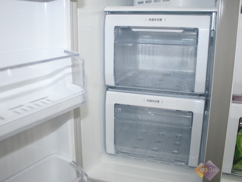 这款冰箱有着比较时尚的外观设计,金属色的面板显得冰箱比较大气,吧台和冰水分离器则更凸显了一种高端和时尚的气息。