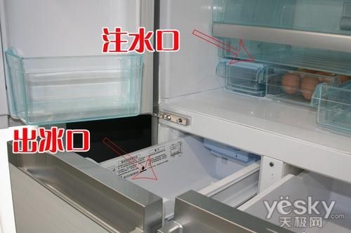 卡萨帝BCD-356WACV选用的是自动制冰技术,在冷藏室内部具有注水口,而在中部具有出冰口,另外,出冰口的一旁是自由存储盒。