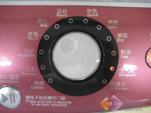 白色的背光使得其现实效果相当不错,洗衣机的各项运转功能,都可以清晰的显示在上面,使得使用者对洗衣机的状态了如指掌。其次就是右边那个多功能转轮,区别于其他厂家的产品,海尔在这项设计上相当下功夫,不仅转轮手感出色,其显示方法也从以往的指针对应机械显示,改为了LED灯光电子显示,各个按键也都有相应的灯光提示,显得高档气派。