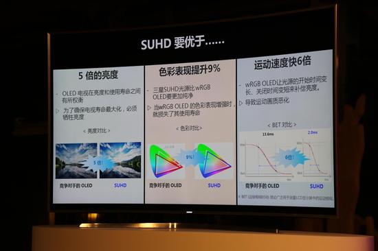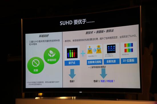 而三星SUHD电视涵盖、改进了这种技术,并加入了其他技术提升,依托量子点产生更好的色域,全新的单元结构和光源让屏幕的亮度也有很大提升。10位面板的应用也让屏幕的对比度与色彩有更好的表现。