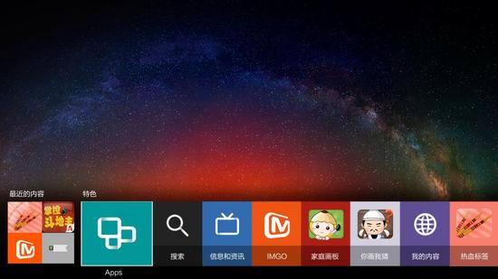 界面底部是最近访问内容快捷方式,会根据用户APP或信号源的使用频率降序排列,点击左侧快捷方式进入菜单界面,里面有电视里已经安装的APP和在线商店,也就是说你可以选择喜欢的应用进行下载安装,目前商店内主流的文字新闻阅读类、视频类、游戏类应用。