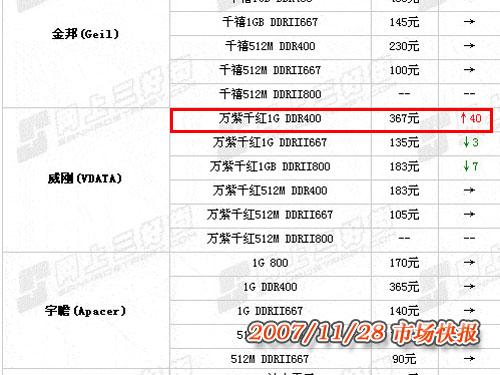 另一方面,DDR继续着它淡出市场的历程。随着DDR芯片的减产和需求的降低,市场上的DDR内存会逐渐上涨,直至消失。越来越多的老一代用户开始放弃升级的意图转而选择最新的平台。11月末,DDR-400内存开始出现了较明显的上涨,其中在11月28日威刚的万紫千红1GB DDR-400内存上涨幅度最大,这与威刚的产品之前价格就偏低,而且没有缓慢上涨,而是将价格一步到位的策略有关。