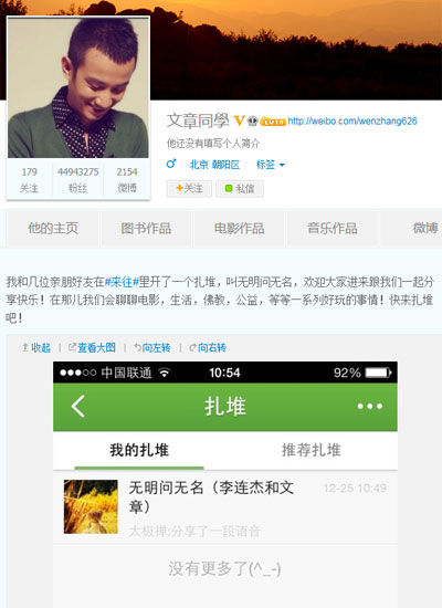 李连杰和文章开设了“无明问无名”扎堆,把朋友圈也带到了这一扎堆。截至今天下午,黄晓明、马伊琍、蔡明、孙俪、慈诚罗珠、马云已先后加入此扎堆,并以文胖子、小M等昵称卖萌示人。这一组合让这一扎堆成为最星光闪闪的“高端”朋友圈。