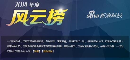 2月8日下午13:00点,主题为“致敬无界时代”的新浪科技“2014年度风云榜”年度颁奖盛典将在北京海航大厦万豪酒店举行,届时新浪科技将对2014年科技领域进行全面的盘点和梳理。