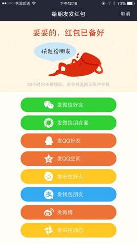换言之,用户用支付宝钱包也可以给自己的微信好友、QQ好友发红包了。除此之外,支付宝钱包的红包功能还支持分享到微信朋友圈。