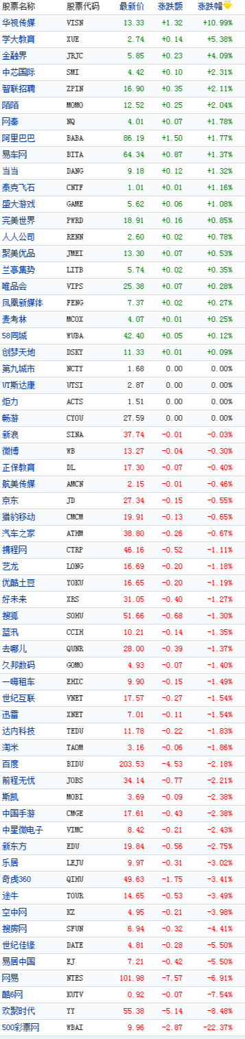 中国概念股周三收盘多数下跌,4支股票跌幅超过6%,500彩票网跌22.37%报9.96美元,欢聚时代跌8.48%报55.38美元,酷6网跌7.54%报0.92美元,网易跌6.91%报101.98美元;3支股票涨幅超过4%,华视传媒涨10.99%报13.33美元,学大教育涨5.38%报2.74美元,金融界4.09%报5.85美元。(峰子)