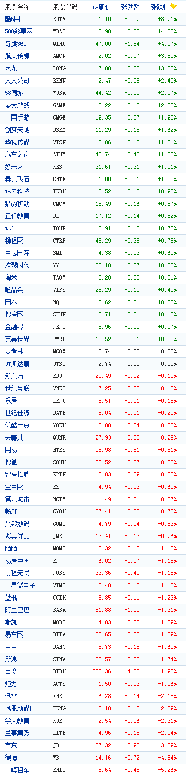 截至北京时间22:10,一嗨租车跌0.48美元,报8.64美元,跌幅为5.26%。微博跌0.72美元,报14.16美元,跌幅为4.84%。京东跌0.93美元,报27.32美元,跌幅为3.29%。另外,酷6网涨0.09美元,报1.10美元,涨幅为8.91%。(拉菲)