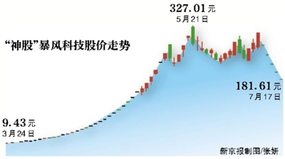 但7月13日,暴风科技带着“10转12的高送转预案”和“投资新领域”两大利好复牌,仍旧一字跌停,截至7月17日,又以跌停收盘,报收181.61元。