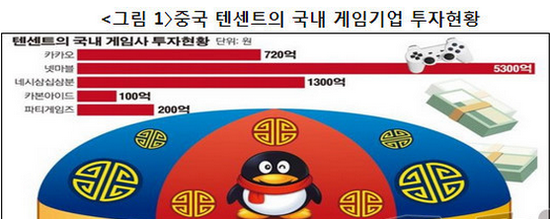 2015年韩国在游戏、电影等文化内容产业上,已经确定的得到中国投资的金额,数量为3兆3千亿韩币,尤其是中国企业腾讯,对韩国的5家游戏公司进行了约为7620亿韩币(约合40.3亿元)的投资,其中韩国第一手游大厂Netmarble,得到了5300亿韩币的投资。