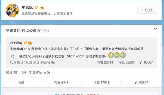 据报道称,昨天,王思聪坐飞机不慎将卡包落在飞机上,其在微博上写道,“昨晚坐MU5160从北京飞往上海把卡包落在了飞机上(黑色卡包,里面有各大银行各式各样的黑卡),哪位好心人捡到了请联系我助理 151011433xx 思聪必有重谢。”