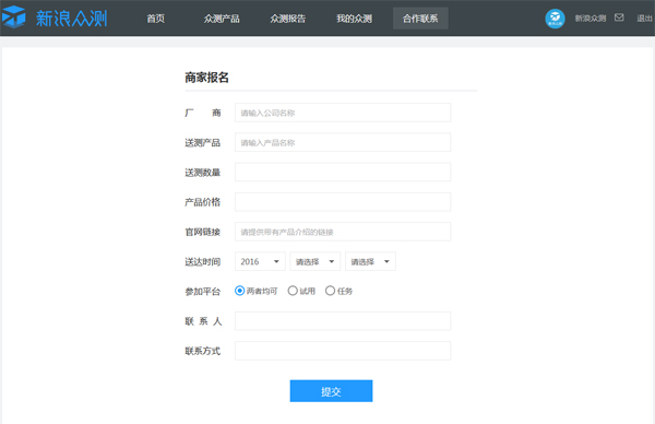 商家报名入口极大的方便了厂商与新浪众测平台的沟通,合作效率大大提高。同时,为了更方便合作的进行,请如实填写所有信息。