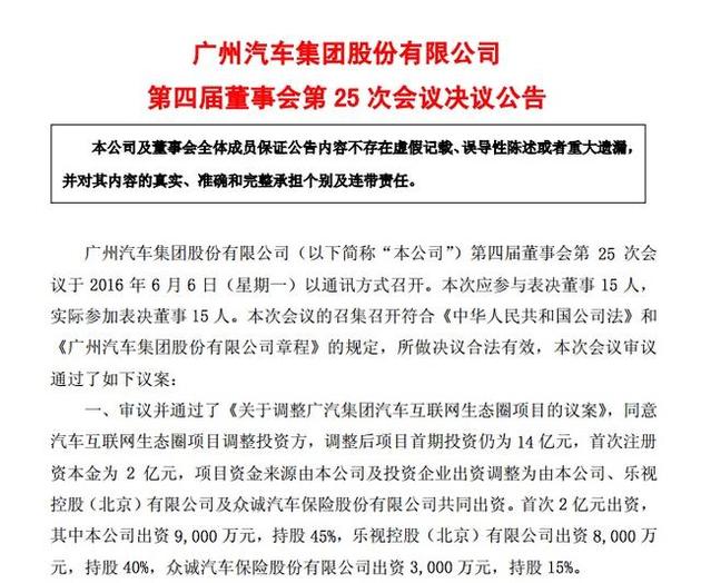 公告显示,该资金来源由本公司及投资企业出资调整为由本公司、乐视控股(北京)有限公司及众诚汽车保险股份有限公司共同出资。