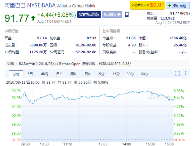 新浪科技讯 北京时间8月12日凌晨消息,阿里巴巴(NYSE:BABA)周四收盘股价上涨4.44美元至91.77美元,涨幅达5.08%。
