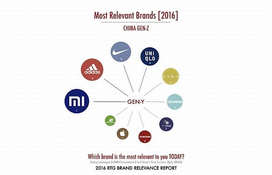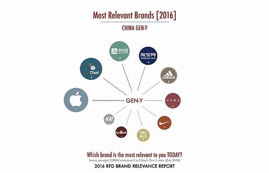 RTG Consulting在上海、成都和北京对4000位15至32岁的消费者进行了街头调查,以确定哪些品牌最受这一人群的欢迎。调查覆盖了服装、电气、科技、移动app、汽车和餐饮等领域。调查结果发布于2016年RTG品牌相关性报告。