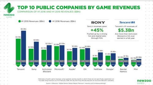 值得一提的,由于先后收购了Riot和Supercell,前者拥有《英雄联盟》,后者则拥有《海岛奇兵》、《部落冲突》等知名游戏,让上半年只有41亿美元营收的腾讯直线增加至53亿美元,致使腾讯位列所有上市游戏公司营收第一位。在腾讯完成对Supercell的收购后,二者几年合计营收将达到130亿美元。