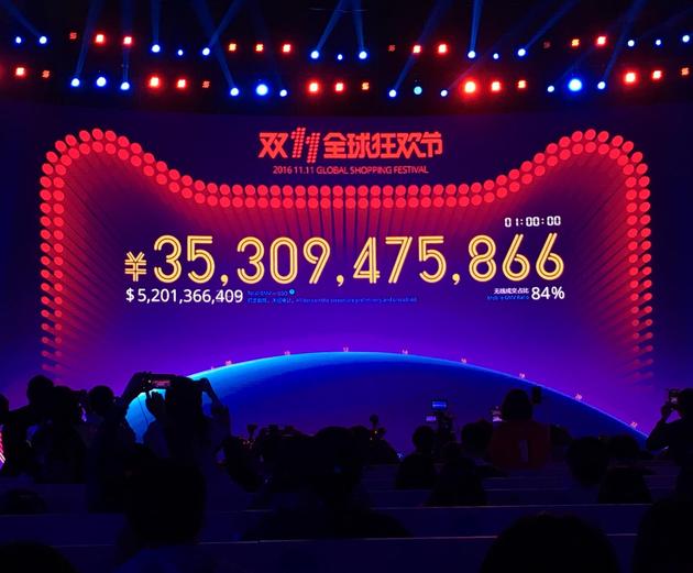 新浪科技讯 11月11日凌晨消息,01:00:57 ,2016天猫双11全球狂欢节交易额超362亿元,已超过2013年双11 ,无线交易额占比84.3%。