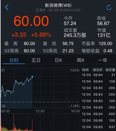 北京时间5月8日晚间消息,微博(NASDAQ:WB)股价周一盘中触及60美元,涨幅达5.88%,股价首次达到60美元,市值达131亿美元,创历史新高。