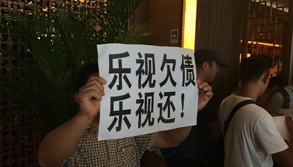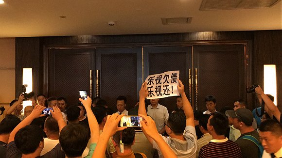 7月17日乐视网召开临时股东大会,大会开始前,活动现场就已经有近30名讨债者举着“乐视欠债乐视还”的标语讨债。据界面新闻记者了解,原本下午2点开始的会议,讨债者在上午9点就来到了现场。