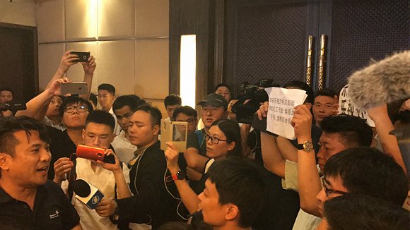 在乐视网临时股东大会现场,讨债者屡次和现场安保、警察发生摩擦,在股东大会进行中,讨债者组成的人群也差点两次挤开大会正门,但都被现场近30名安保和酒店人员拦住。