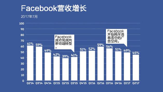 ——2017年第二季度,Facebook移动广告营收在总广告营收中所占比例约为87%,与2016年第二季度约84%的占比相比有所上升;