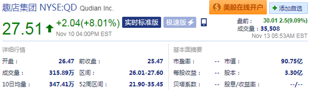 新浪科技讯 北京时间11月13日晚间消息,趣店股价盘前大涨超9%,至30.01美元。趣店刚刚发布上市后首份财报财报,净利润为6.507亿元人民币,同比增长321.8%。