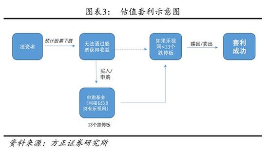 方正证券韩振国团队认为,如果乐视网在13个跌停板前提前开板,投资者就可以通过申购基金,等待乐视以市场价交易基金调整估值方法(高于 3.90元),赎回基金进行估值套利。场内基金则更为便捷,可以通过在二级市场卖出的方式退出,费率上也更占优。换而言之,投资者相当于以 3.90 元买入乐视,以更高的价格卖出。