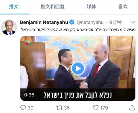 当日晚些时候,内塔尼亚胡在个人twitter上发文:与马云进行了一次精彩的会面,我们共同就教育、贸易、人工智能等话题,进行了一次面向“未来”的探讨。(韩大鹏)