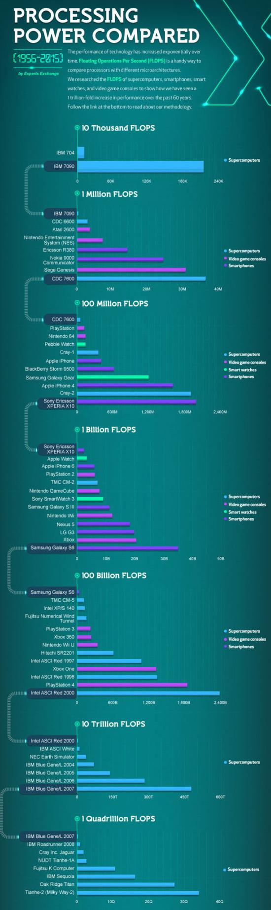 在上面这张图片中,按照不同量级的每秒浮点运算次数(FLOPS)区分,使用不同颜色将超级计算机(蓝色)、游戏机(深粉色)和手机(紫色)的运算能力从小到大列出。