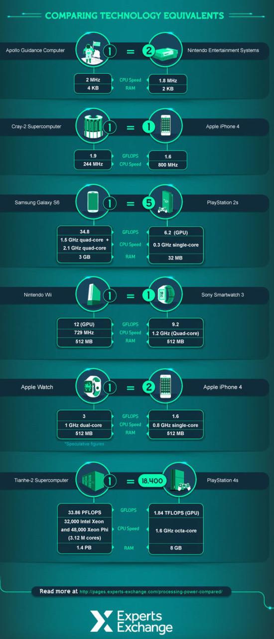 在第二张图中,可以更清楚地看到跨越几年甚至几十年的两款电子计算设备性能之间的差别。比如,从 CPU 主频和运存来看,红白机只比当年登陆月球的阿波罗飞船的导航电脑差一倍,而苹果刚刚正式推出的 Apple Watch 的性能基本等于两台 iPhone 4。