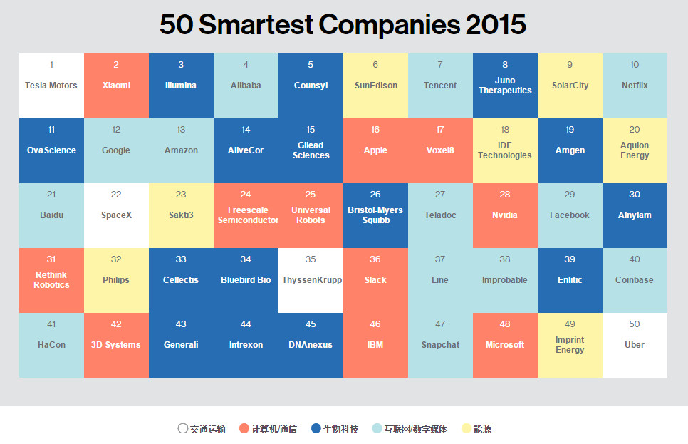 新浪科技讯 北京时间6月25日上午消息,《麻省理工科技评论》(MIT Technology Review)刚刚评选出今年全世界“最智能”的50家企业,特斯拉名列榜首,小米位居第二。