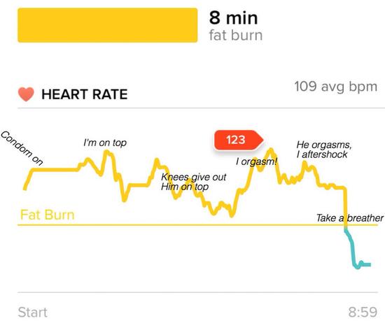 使用过Fitbit智能手环的用户或许会对下面这张图比较熟悉?一般情况下,佩戴Fitbit的用户会用这类智能设备追踪自己锻炼时的身体数据,但这位名为noveltysin的Reddit用户却开辟了一项新的使用途径:用Fitbit监测自己和伴侣滚床单时的心率变化。