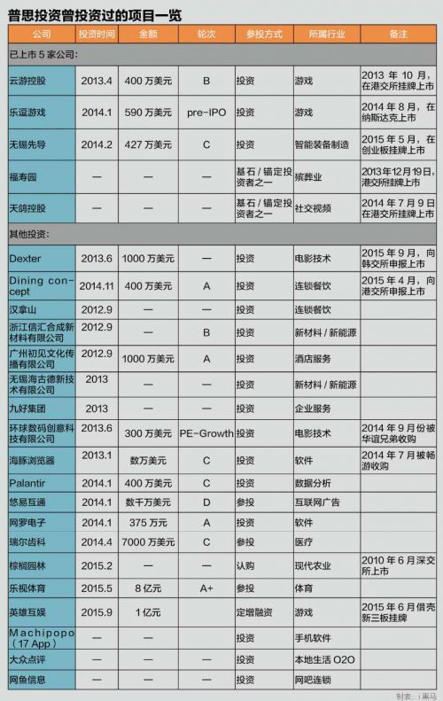 其二,普思投资偏好PE-Growth。普思投资在投资宗旨中指明:投资于大中华地区高成长中小优质未上市企业股权,以取得少数股权的投资方式为主。并表示,基金主要投资于成长期公司。初创和早期公司,并不是它的主要投资对象。因此,国民老公的投资成绩单里,出现这么多家上市公司和提交上市申请的公司,就不让人意外了。普思的投资偏好就是PE-Growth。