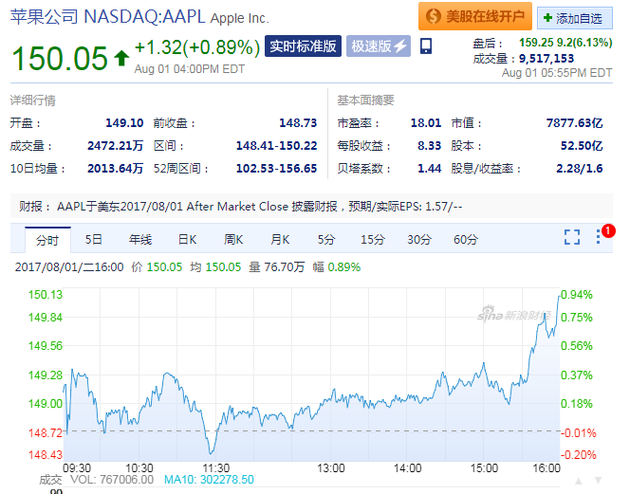 新浪科技讯 北京时间8月2日早间消息,苹果公司今天发布了2017财年第三财季业绩。在常规交易中苹果股价上涨1.32美元,报收于150.05美元,涨幅为0.89%。在随后截至美国东部时间18:00(北京时间2日6:00)为止的盘后交易中,苹果公司股价再度上涨9.2美元,至159.25美元,涨幅为6.13%。过去52周,苹果公司的最高价为156.65美元,最低价为102.53美元。