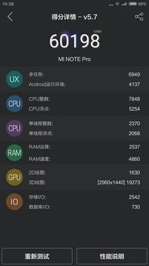 在日前的小米Note顶配版品鉴会现场,小米官方给出的小米Note顶配版安兔兔跑分成绩达到了63424分。为了追求这样的高分,笔者先是将手机恢复出厂设置,以减少机身内存占用,并将手机的电量充至100%,不过其跑分最高不过55000分左右,并未超过60000分。于是,笔者又将手机切换至“流畅模式”,手机重启后,其跑分成绩达到了60198分,如上图所示。