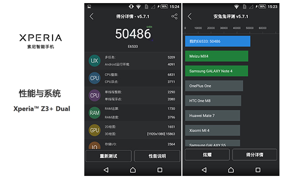 性能方面,此次索尼采用高通骁龙810 八核 2GHz 64位处理器+3GB RAM的组合,仅从参数上看确实也是目前旗舰机标配。但由于高通今年旗舰SoC上有着“发烧”之名,针对高温降频和性能优化,每家也有不同的方法,所以跑分目前看来还是必要的。